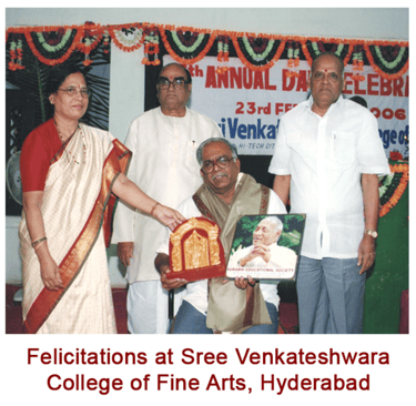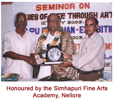 The Andhra Academy of Arts, Vijayawada, Rajahmundry Chitrakala Niketan, Konaseema Chitra kala Parishat, Chitra kala Parishath, Visakhapatnam, Bhagiradhi Art Foundation, Rajahmundry, Simhapuri Fine Arts Academy, Nellore, Sanatana Dharma Trust, Bhimili, Lalitha kalabhirama Pincham, Kadapa, AA art Academy, Nellore presented their life time success awards to him to mention a few.